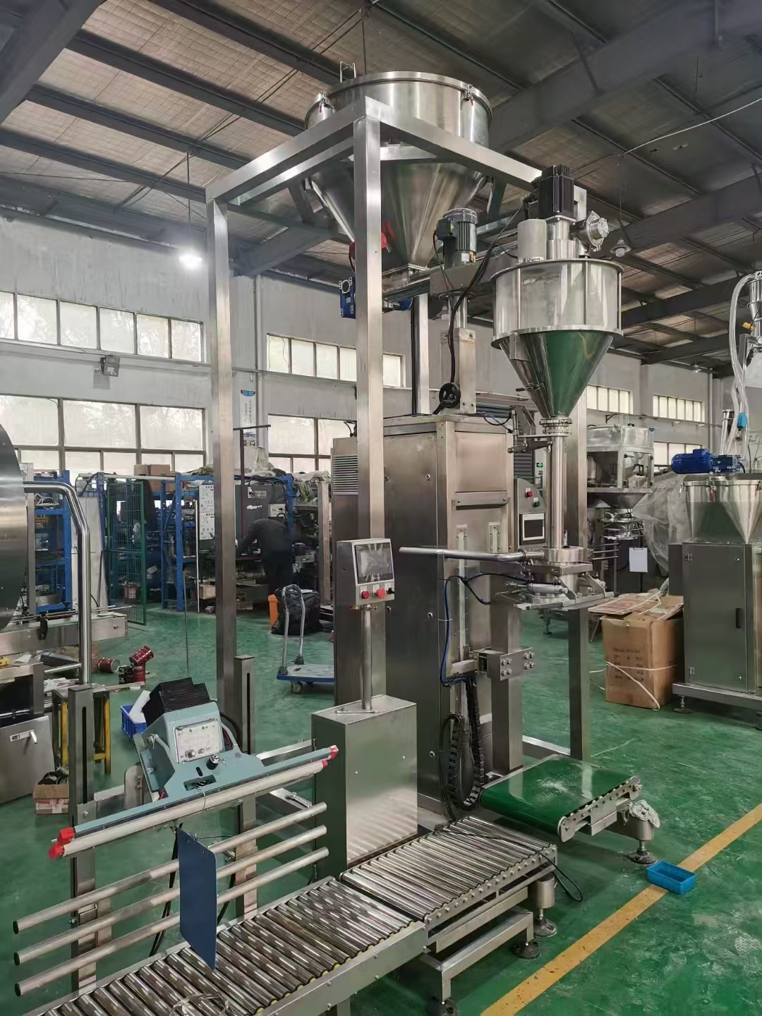 9、包裝秤使用過程:人工協(xié)助上袋,自動稱重、夾袋、充填,經(jīng)輸送帶傳遞進行自動封口或縫包
